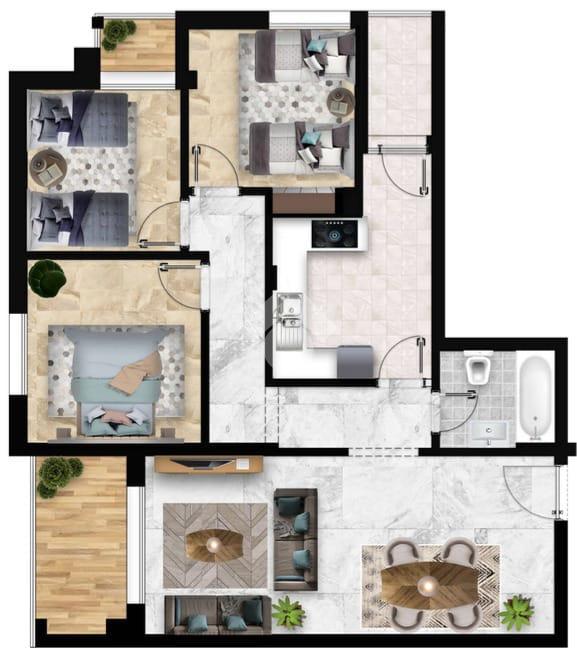 Cet appartement S+3, situé au rez-de-chaussée, s’inscrit dans un projet direct promoteur, composé d’appartements de type S+1, S+2 et S+3, bénéficiant d’un emplacement privilégié en deuxième position par rapport à la mer et à quelques mètres de la route touristique.